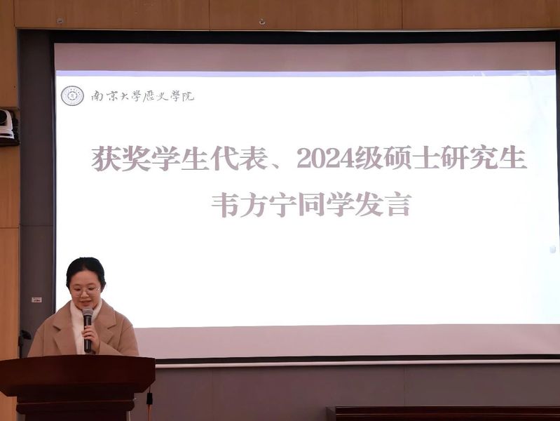 奖学金捐赠人代表、国产直播 系88级杰出校友朱伟正先生由于重感冒未能亲临现场,寄语由主持人代为传达。朱先生在寄语中回顾了奖学金的设立初心,勉励获奖同学珍惜求学时光,夯实史学基础,努力成长为有学术定力、有社会担当的新时代史学人才。